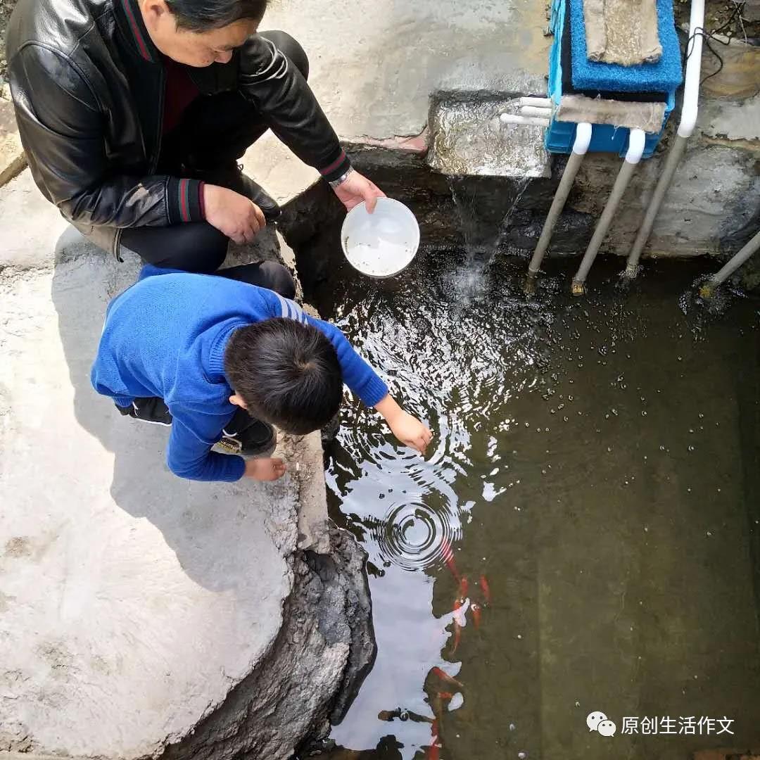 “来来来,去花园喂鱼去喽!”爷爷的声音响起来了。耶,又可以喂鱼啦!我兴奋得像跟屁虫似的马上跟上爷爷。