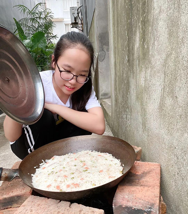 砌完灶就可以开始烧野火饭了,火候的控制极为重要。倒入淘过的米和洗过的咸肉,大火烧二十分钟。再加入豆子、笋丁和胡萝卜丁,小火慢煮半小时,等锅中开始“咕嘟咕嘟”冒泡就可以熄火了。熄火以后可不能立马起锅,一定要焖上十分钟,这样烧出来的饭才不会软趴趴的。掀开锅盖,香味悄悄溜进了我们的鼻子里,一不留神口水就挂在了嘴边。我们顾不得烫口就开始狼吞虎咽,不知何时,那一大锅香喷喷的野火饭便已消失得无影无踪了。