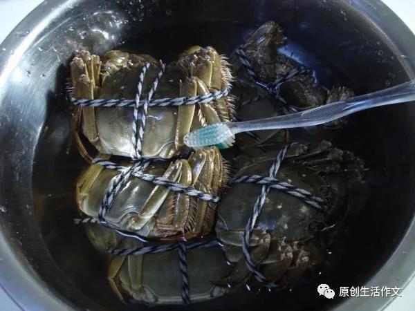 到了家,妈妈开始清洗螃蟹。她先让螃蟹享受一下清水spa,再用牙刷帮螃蟹逐个“按摩”。这时的螃蟹就像一个个大Boss,舒服地躺在“浴缸”里,任凭人服侍。彻底清洗完后,妈妈就把螃蟹肚子朝天倒放在大蒸锅里,说这样是为了防止蟹黄流出而浪费,真是够精打细算的!
