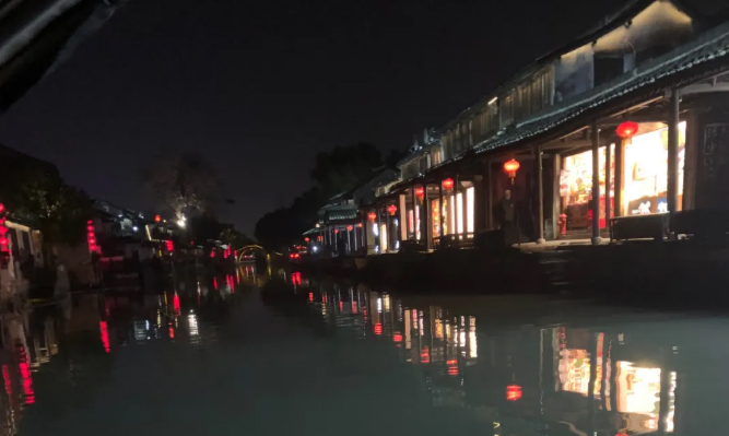 这是一个宁静的夜晚,我们一行人坐在一艘舒适的乌蓬小船上,摇摇晃晃,如在婴儿的摇篮。水天一色,灯火阑珊,凉风袭来,轻云飘过,两岸的小店虽然门可罗雀,却也仍然红火,对联、福字、灯笼、匾牌处处皆有。摇着橹的老爷爷轻声慢语地和我们聊着天,说着游人的稀少,但却没有悲观,赞扬着浙江的好:风景好,人好,疫情控制得好。