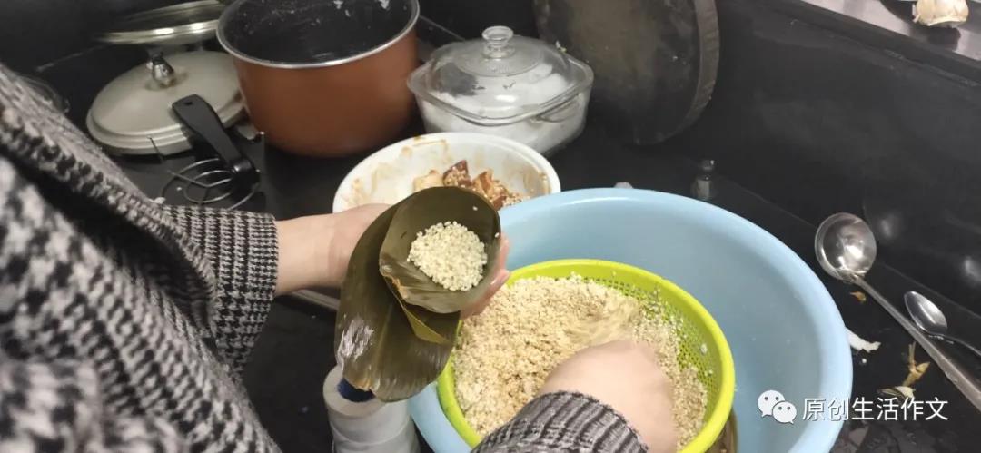 我也拿起一大一小两片棕叶,将它们叠在一起,以中点为轴线,圈成一个“漏斗”。我仔细看着妈妈的每一个动作。抓起一把糯米,往“漏斗”里放,再放进一个枣,撒上一层糯米,内部工作就完成啦!